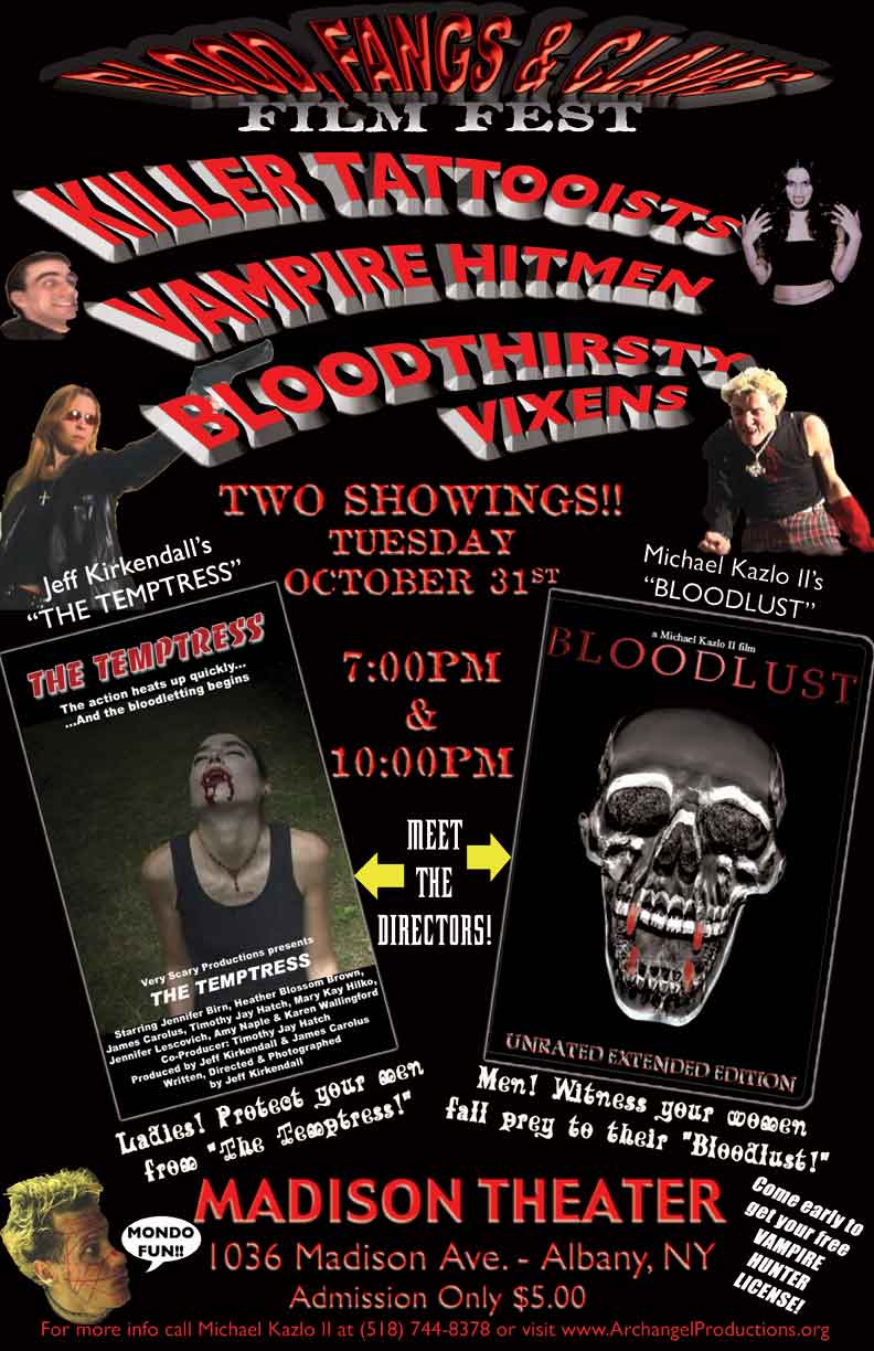 On behalf of Jeff Kirkendall and myself, thank you to all those who came out to support local independent movie making. For those of you who didn't go, the B, F & C Film Fest was a night of B-movie fun that showcased my vampire action feature, BLOODLUST as a double feature with Jeff Kirkendall's vampire classic, THE TEMPTRESS. It was a fun, campy time with a free door prize for everyone that came. Costumes were welcome and ecouraged and a few did dress up.